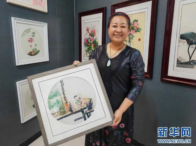田慧君在她位于隆德县城的慧绣坊展示自己的刺绣作品。新华社记者 马思嘉 摄