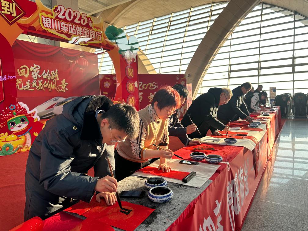 22日上午,银川火车站二楼候车室里人头攒动,在明艳靓丽的大型背景墙“回家的路就是最美的风景”前,一场“万福迎春”迎小年送福活动正在开展。来自宁夏书法家协会的十余名老师和铁路工作人员挥毫泼墨,为旅客回家旅途带上文化“厚礼”。