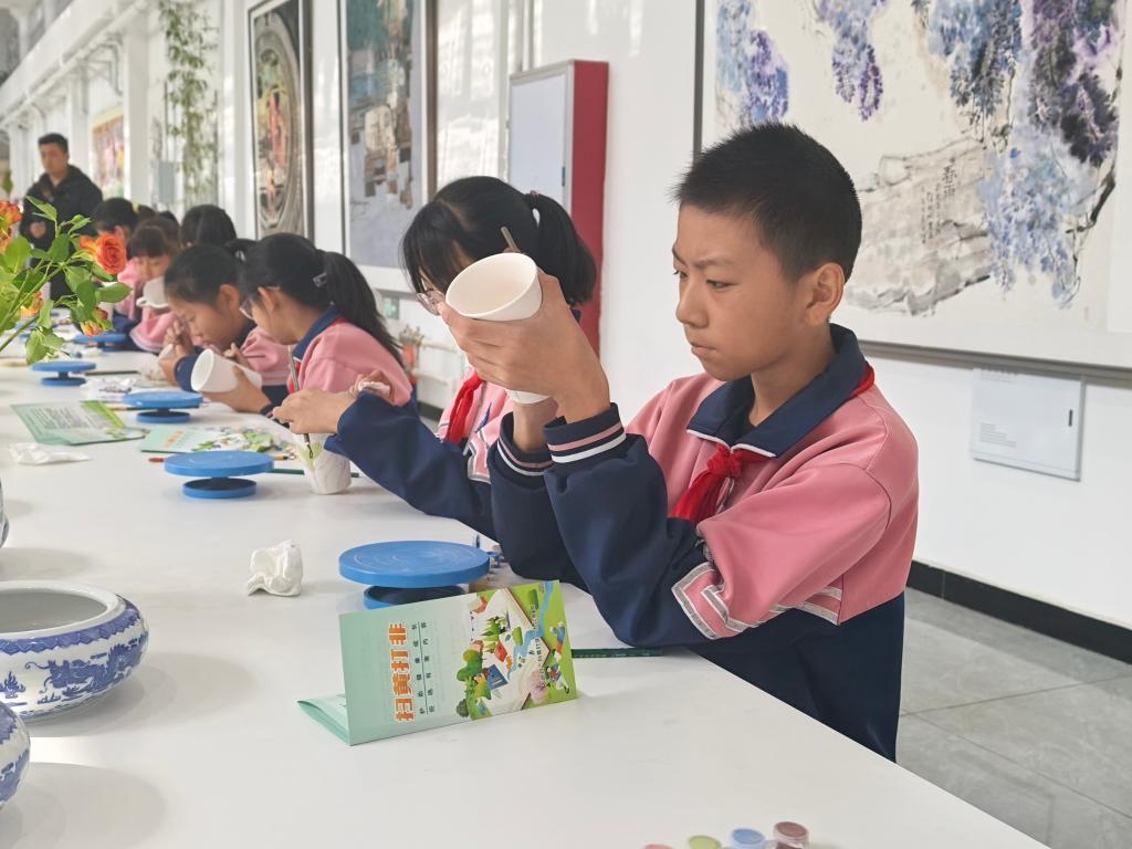 石嘴山市大武口区洗煤厂工业遗址公园的贺兰山陶瓷艺术馆内,几十名小学生正全神贯注地制作带有“绿书签”“护苗”等字样的陶瓷文创。“通过让孩子们在陶瓷彩绘的创作体验中了解‘绿书签’‘护苗’,既有助于孩子们的身心健康,也能够提升他们对非遗文化的热爱。”贺兰山陶瓷艺术馆馆长陈刚刚说。