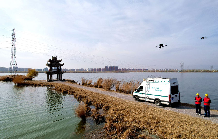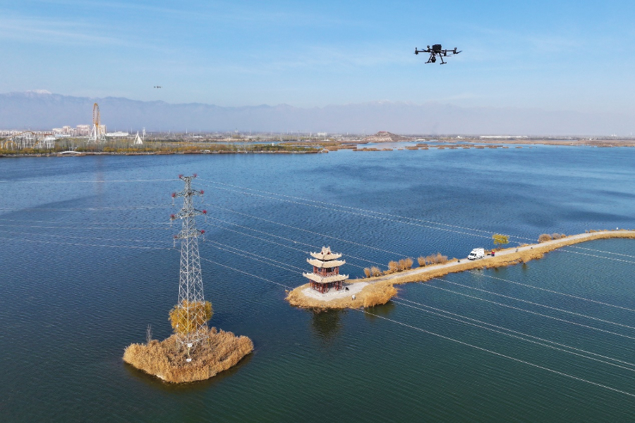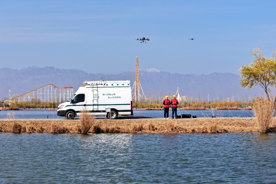 11月12日,在宁夏回族自治区银川市金凤区,国网银川供电公司输电运检中心员工利用大疆M350及M4智能无人机设备对110千伏花安线进行线路巡视、红外监测,保障输电线路安全运行。周序鹏 摄