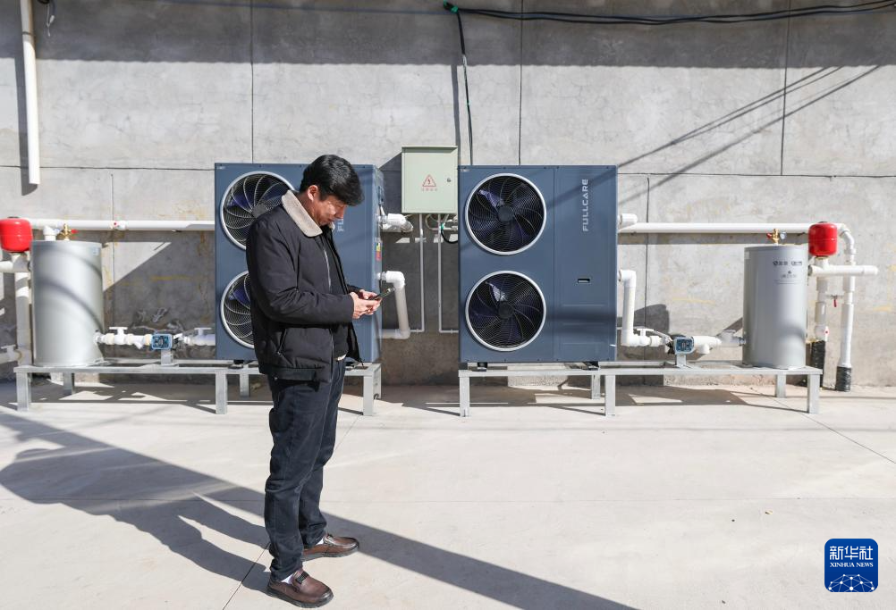 11月27日,宁夏吴忠市同心县豫海镇园艺村,村民用手机调节空气能采暖设备的水温。