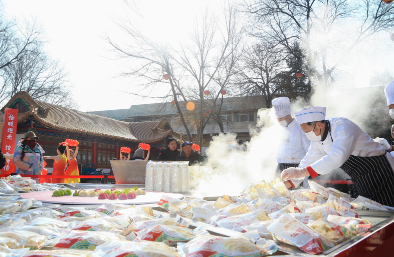 宁园分会场尽显古风雅致。依托园林古建与现场年味十足的布置让休憩时光更显惬意,打卡区前游客络绎不绝。活动特别为环卫工人准备了免费饺子,让坚守岗位的劳动者在寒冬中感受暖心关怀。分时段开启的饺子品鉴环节避开人流高峰,市民在亭榭间品味美食的同时,还能欣赏《中华全家福》《你要跳舞吗》等精彩歌舞,参与NPC互动与诗词飞花令,沉浸式体验“拾暖”主题的温馨。