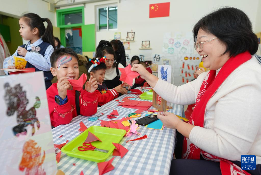 新年临近,宁夏银川市邮电幼儿园举办“非遗传承 萌宝迎新年”活动,邀请醒狮、剪纸、糖画、川剧变脸等非遗项目传承人,现场为孩子们带来展演体验活动,让孩子们近距离感受中华优秀传统文化。新华社记者 王鹏 摄
