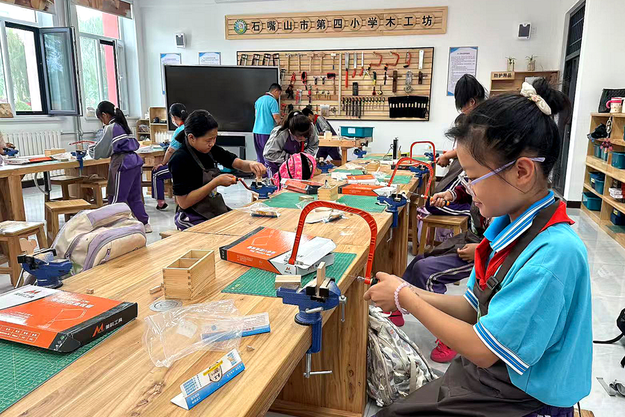 石嘴山市第四小学匠心打造特色木工坊,以“木艺启智、巧手筑美”为方向深耕美育实践。学校打造标准化木工实践教室,配齐刨、锯、磨等专业工具,开设木工创意特色课程,从基础的木料打磨、拼接,到榫卯结构探究、创意作品制作,层层递进培养学生动手能力与创新思维。通过“课堂教学打基础+课后工坊练技艺+创意创作提素养”模式,让学生在木料选材、画线雕琢、打磨成型的过程中,体悟匠心之美、感受造物乐趣,一件件木勺、木牌、创意摆件在学生手中诞生,既练就了动手能力,更涵养了专注细致的工匠精神。