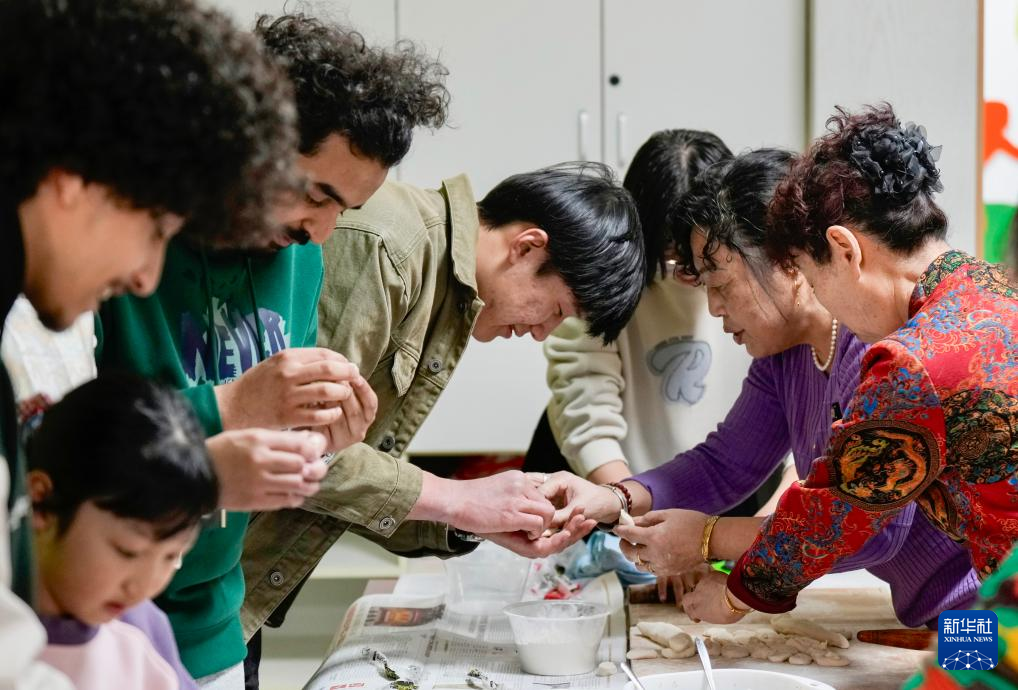 2月5日,北方民族大学国际教育学院的留学生在宁夏银川市西夏区芦花洲社区和当地居民一起包饺子。