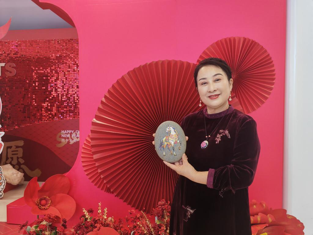 2月7日,宋笑珍携带自己专为马年春节创作的黄河石画系列作品亮相2026年“在宁夏·非遗过大年”文旅系列活动启动仪式。形态各异、色彩不同的马与黄河石有机融合,展现出蓬勃向上的精气神。“我创作这些作品,就是希望能把非遗和年俗结合,给大家送去美好祝愿。”她说。