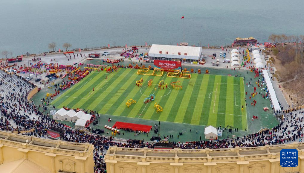 3月1日,在宁夏银川市览山公园,参赛社火队的演员在比赛中(无人机照片)。新华社记者 马思嘉 摄