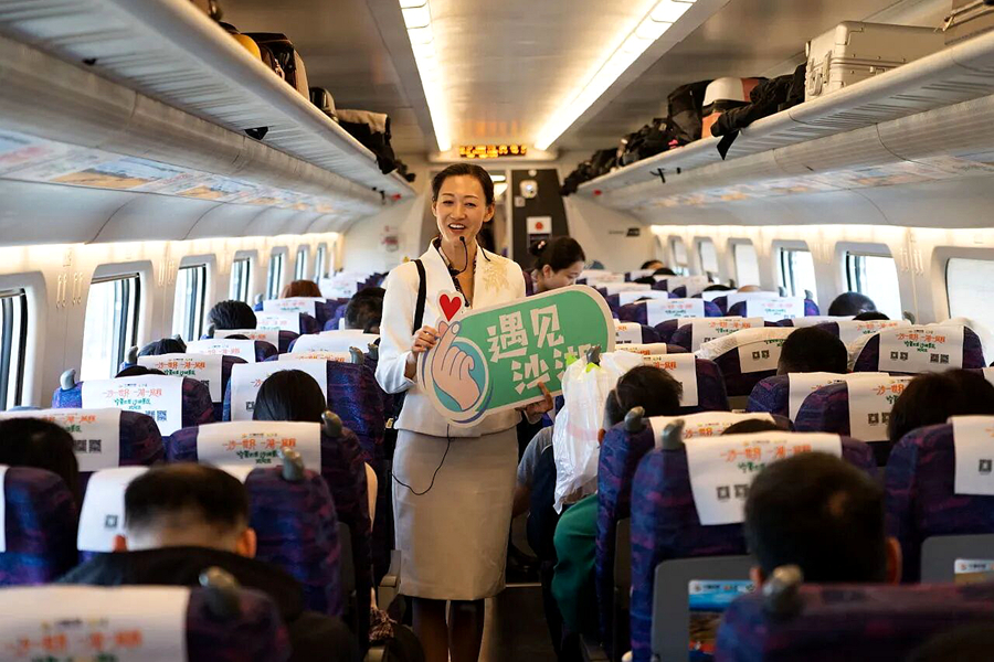 随着列车鸣笛启程,车厢内文旅推介同步开展,国风琵琶演奏、宁夏花儿非遗表演轮番上演,工作人员贴心发放沙湖文旅礼包,细致讲解宁夏沙湖景区游览攻略与沿线专属优惠政策,搭配趣味互动问答,让旅客在高铁旅途中沉浸式感受沙湖“沙水共生、候鸟翩飞”的独特景致,领略“塞上江南”的秀美风光,实现旅途场景与文旅宣传无缝衔接。