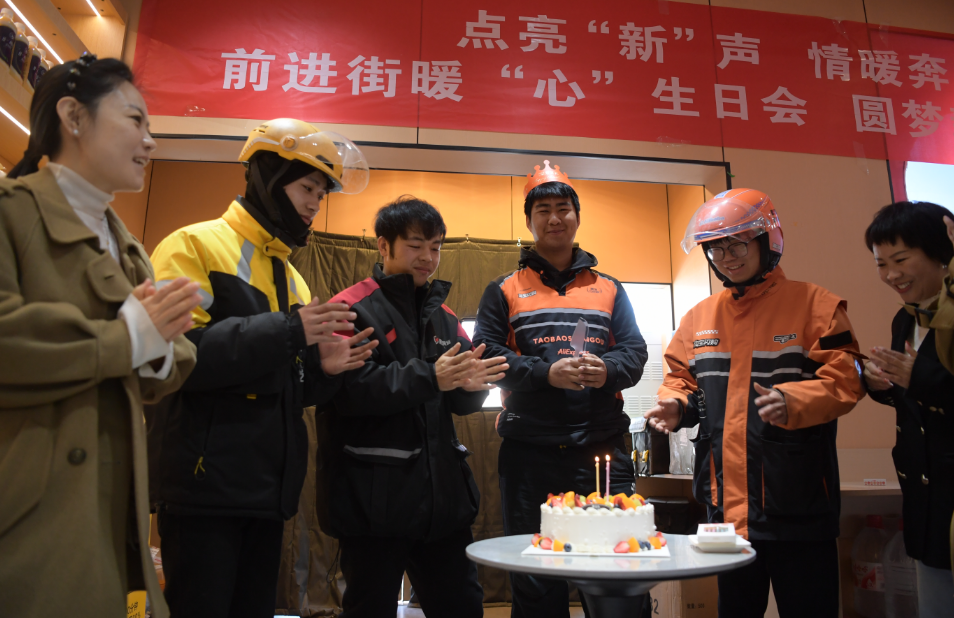 3月18日,前进街拉巴斯共享骑士公寓酒店职工之家里暖意融融、歌声飞扬,前进街工会联合西塔社区精心策划的暖“新”生日会,温暖回应了陈渊博等6名3月份过生日新业态从业者,自此,城市“奔跑者”们在这片区域有了专属纪念日。
