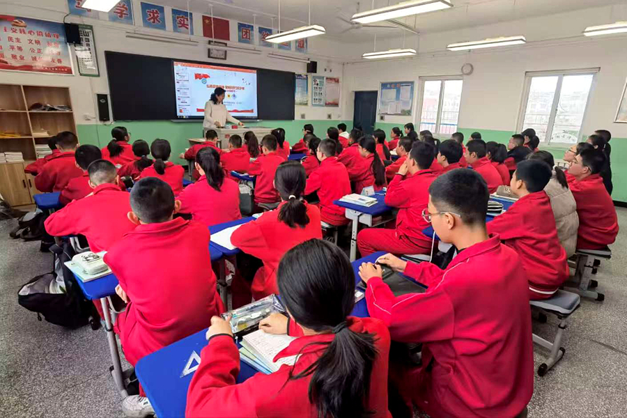 在同一天下午,石嘴山市第八中学教育集团东校区,一堂别开生面的英语课也在同步进行。屏幕这头,东校区的学生与国外友好学校教师热烈互动;屏幕那头,西校区的学子通过在线课堂实时共享,虽然身处不同校区,求知的渴望却同频共振。