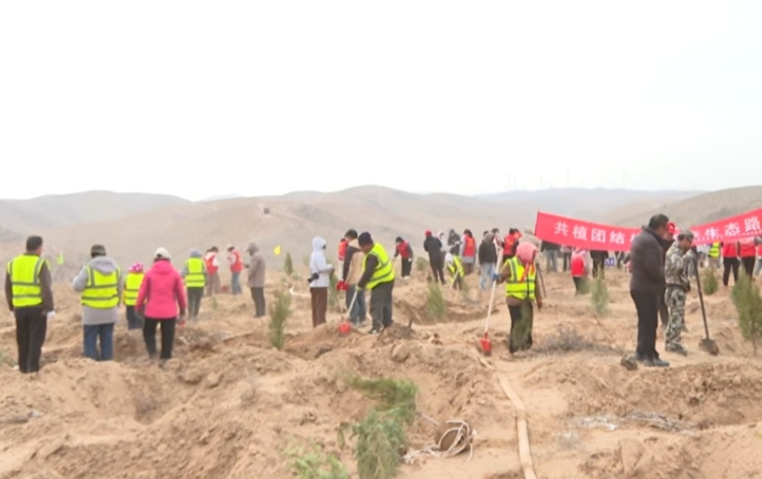 挥锹铲土、扶苗培土、回填踩实……近日,2026年中宁县干部职工义务植树现场热火朝天,一棵棵刺梅、侧柏、刺槐幼苗迎着春风挺立,为南山增添了新的生机与活力。